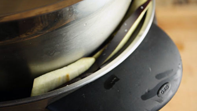 Step2Find a bowl that fits nicely in the colander on top of the eggplant and fill it with water to give it some weight. Set the bowl on top of the eggplant to press it down. This will squeeze out some of the bitter eggplant liquid. Let it sit for 30 minutes.