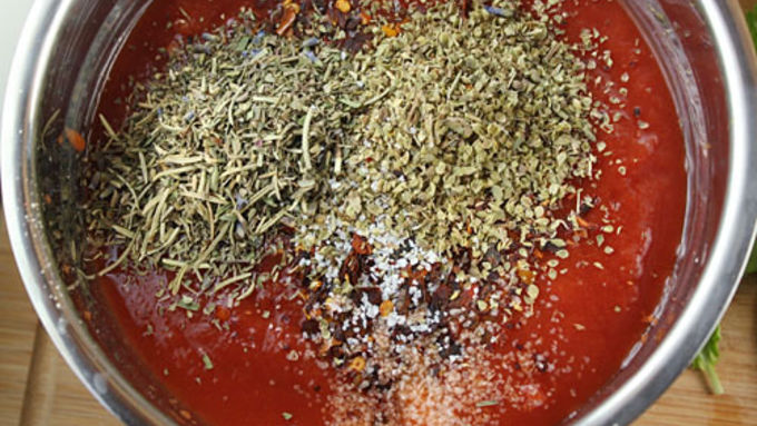 Step4For sauce, mix tomato sauce with spices and taste for salt and pepper. Set aside until needed.