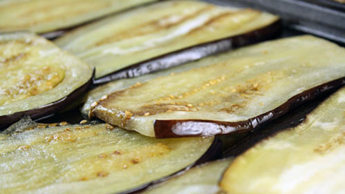 Step3Rinse eggplant slices well with cold water to wash off salt. Dry off the eggplant and line the slices up on two baking sheets. Drizzle both sides of eggplant slices liberally with olive oil. Bake eggplant at 350°F for about 7-8 minutes per side. They should be soft, but not scorched. Remove them from the oven and let them cool.