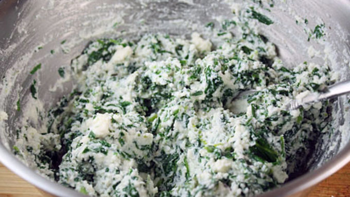 Step6Squeeze out as much liquid as possible from the spinach and roughly chop it up. Mix chopped spinach with other filling ingredients.