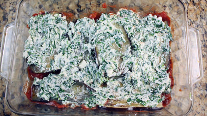 Step7To build lasagna, add a small amount of sauce to the bottom of a greased 9x13-inch pan. Add a layer of eggplant slices. Add a bit more sauce and half of your ricotta filling. Add another layer of eggplant slices and the last half of the filling. Add more sauce also. You should use about 1/4 of the sauce for each layer.