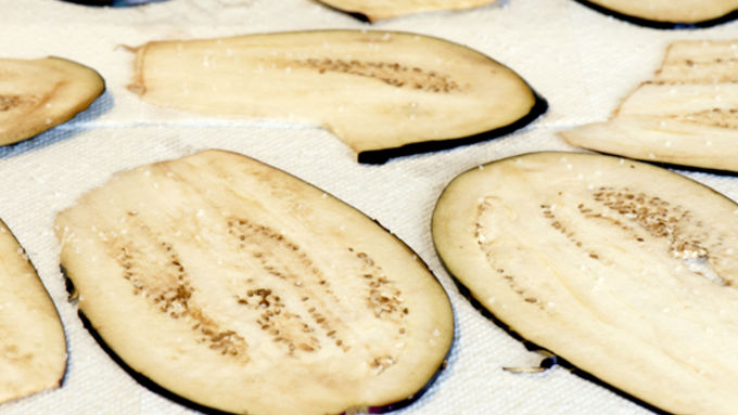 Step1Layout eggplant slices on paper towels, sprinkle with salt and top with another layer of paper towels. Allow to sit for a few minutes. This will remove some of the water from the eggplant and make it more tender.