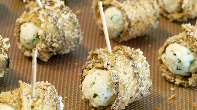 Step9Spoon about a tablespoon of the cheese filling, and roll lightly into a ball. Place on one end of an eggplant strip and roll up. Secure roll with a toothpick. Place the eggplant rolls on a baking sheet and bake for about 5 minutes, until the filling is just warm and the cheese is beginning to get melty.