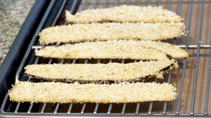 Step7Cut the eggplant slices into thirds, lengthwise – you'll have about 50 full strips. Dip each eggplant strip first into the eggs and then into crumb mixture, coating both sides. Place on prepared baking rack.