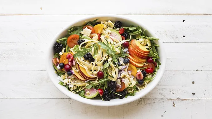 - There are so many things to crave about summer. The bright, fresh berries. The juicy peaches and nectarines. The zesty garden-fresh greens. The bright red cherries. The fresh-picked tomatoes (which really do taste better straight off the vine). So when we set out to create the ultimate summer pasta, we figured—why force ourselves to decide between all of the favorite seasonal produce options?! Hit the farmers’ market, grab everything from stone fruits to peppery arugula, and toss them all into an al dente fettucine. The result is this stunning salad, drizzled with sweet white balsamic vinaigrette, and just begging to steal the show. Or, at least, the potluck. Whenever you’re craving summer, this recipe will do you right.