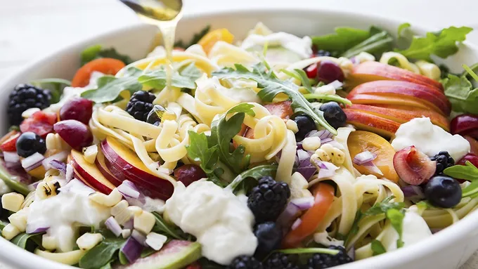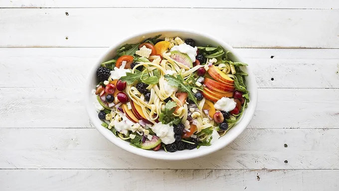 Step1In a large serving bowl, toss together pasta, arugula, heirloom tomatoes, nectarines, corn kernels, onion, radish, blackberries, blueberries and cherries.