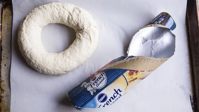 Preheat oven to 375°F. Line a baking sheet with parchment paper. Open the French bread dough and place the dough log on a surface sprinkled with flour. Use your palms to roll the log of dough until it’s about 20 inches long. Circle the dough into a ring and pinch the edges together to seal. Place on the prepared baking sheet and bake for 20-22 minutes, or until the top starts to brown.