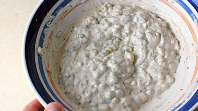 Step1Mix the tzatziki ingredients and allow to sit in the fridge while preparing the rest of the meal.