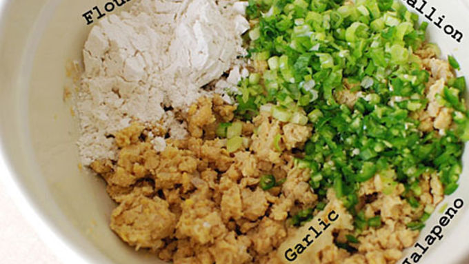 Step2Strain and rinse the chickpeas. Lightly mash so there are no more whole chickpeas but it still has some texture. Add flour, diced jalapeno, diced spring onions, and minced garlic. Mix well.