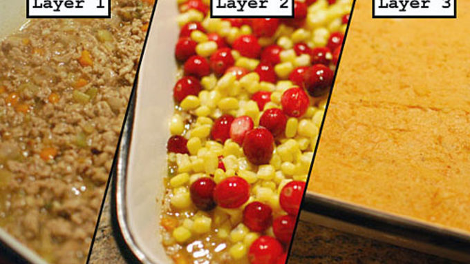 Step4Add the turkey mixture to the bottom of a casserole dish. Next, mix together the corn and cranberries and add them on top of the turkey. Finally, add the mashed sweet potatoes to the top and bake at 350°F for about a half hour.