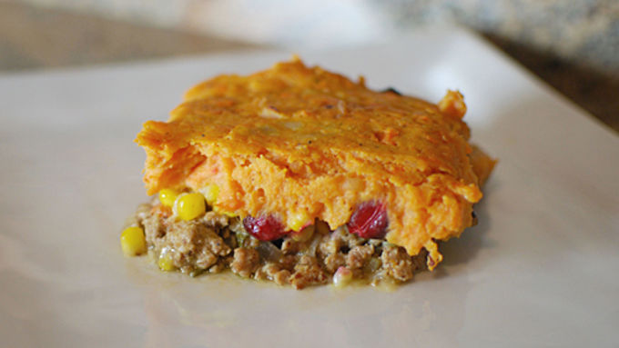 A twist on a classic shepherd's pie that uses the type of flavors people crave in the autumn, like ground turkey, cranberry and sweet potato.
