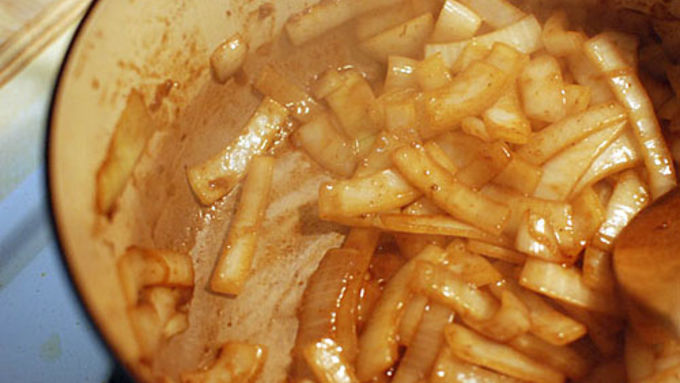 Step2Add the onion to the pan, scraping the pan to release any brown bits. If there is any stubborn brown bits that are beginning to burn, splash a little water into the pan and they should come off easily. Cook the onions until they are beginning to brown. Add the garlic and cook 2 minutes. Add the spices and stir to coat everything.