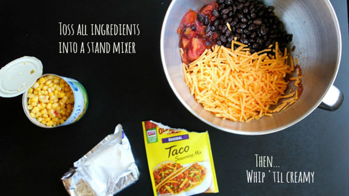 Step1In a large bowl or stand mixer, beat together the cream cheese, yogurt, mexicorn, black beans, tomatoes, taco seasoning, and cheddar until smooth.