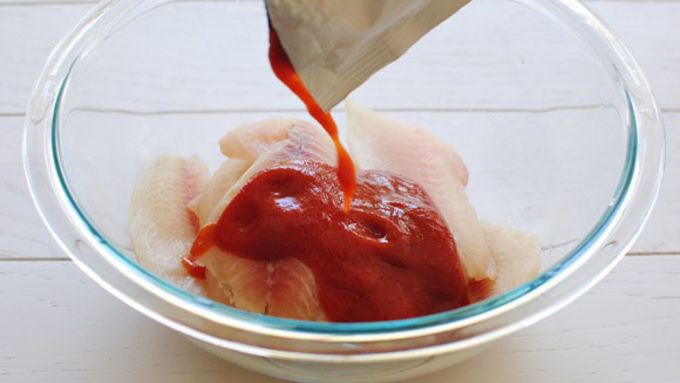 Step1Start by pouring the taco sauce (from the dinner kit) over the tilapia fillets in a big bowl. Let marinate 20 minutes.