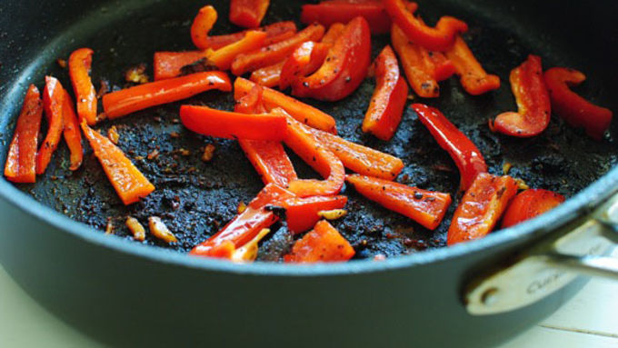 Step4Back in the pan, add the red bell peppers and sauté for 3 minutes, or until crisp-tender. Season with a small pinch of salt and pepper.