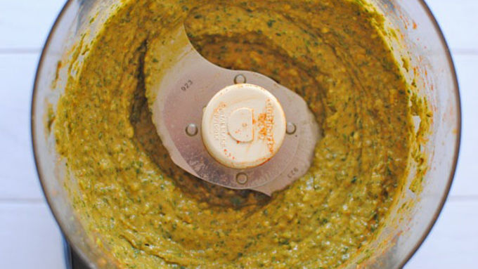 Step2In a food processor, combine the cilantro, 2 tablespoons oil, taco sauce, garlic, honey, 1 teaspoon taco seasoning mix from dinner kit, avocado and a pinch of salt. Pulse until combined and smooth. Set aside.