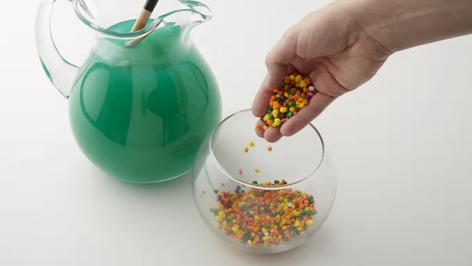 Step2To serve, divide the Nerds® candy between three fishbowls and place at the bottom of the bowl. Add ice, then arrange the fish around the outsides of the fishbowls, using the ice to hold the fish in place against the glass.