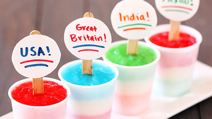 - Cheer on your favorite country or team with these colorful and cute frozen pops! I admit that I’m multitasking writing this. You’ll have to forgive me, but like people all over the world, I'm rooting for my favorite teams! Without a doubt, one of my favorite things is cheering for the athletes with my good friends. It is just so much more fun to “oooh” and “ahhh” and cheer together! So, for a snack to bring when we watch together, I decided to make these patriotic Flag Freezer Pops to celebrate the different countries. Granted, I went a little overboard and made freezer pops for about 15 countries, but you could easily just make a batch for your favorite country. Or for the top few countries in a specific race or event. Either way, these are super easy, and a super fun way to show your spirit as you watch the excitement from London! Feel free to pop a cute label on the sticks. Or for something simpler, you can also just write something directly on the stick with a good marker. (Such as “Go USA!” or "Vive la France!" -- both in the same colors, by the way!) Then squeeze the cups and slide the pops out! And cheer on!