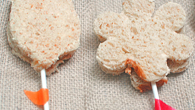 Step2Make peanut butter and jelly sandwiches with the cutouts and slide the lollipop stick between 2 cutouts.