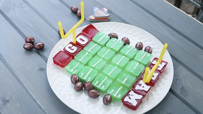 Step4Once the “grass” is laid down fill in the end zones and create the yard lines with sour cream.