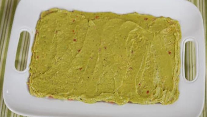 Step3Next layer is guacamole for the grass. Spread it evenly on top of the cheese.You’ll need a lot to cover a whole “football field” so make sure you get a lot of avocados!