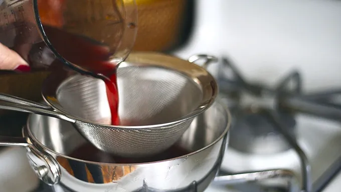Step2Combine juices and strain into small saucepan to remove pulp. Stir in sugar.