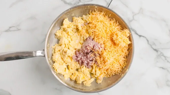 Heat a second large skillet over medium heat and spray liberally with cooking spray. Add in the eggs and scramble until cooked through, about 10 minutes. Remove from heat, and stir in the cheese and ham. Season with salt and pepper and set aside.
