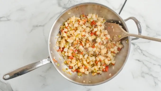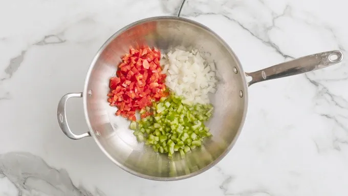 Melt 2 tablespoons of butter in a large skillet over medium high heat. Add in the onion, red bell pepper and green bell pepper, and cook until tender, about 5 minutes.