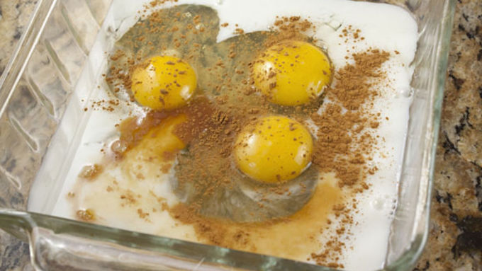 Step2In a wide dish whisk together eggs, milk, vanilla, cinnamon, and a pinch of salt.