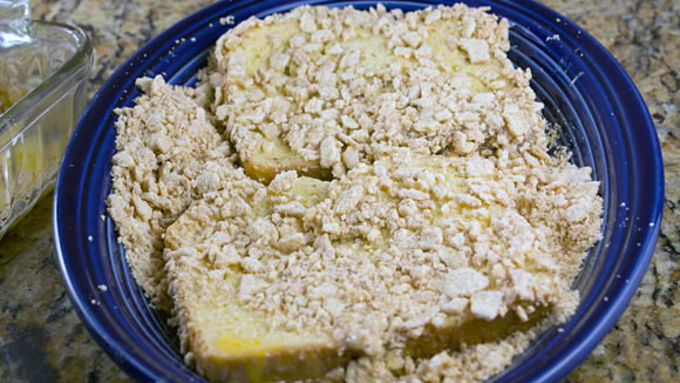 Step4Working with 2-4 pieces of bread at a time (depending on the size of your pan), dip each piece of bread in the egg mixture. Then transfer to the cereal coating and coat both sides.