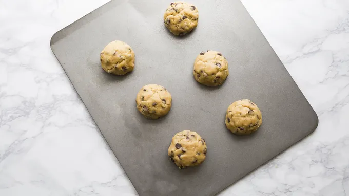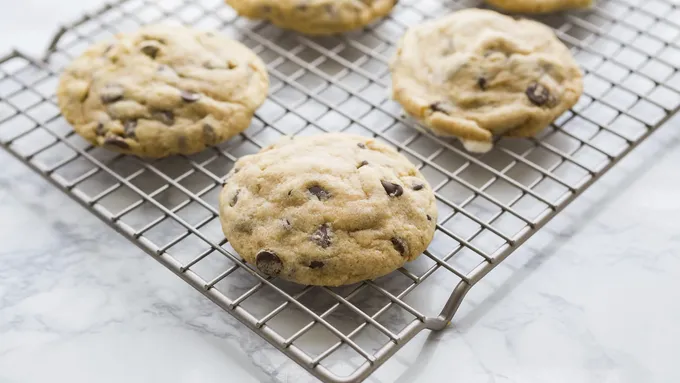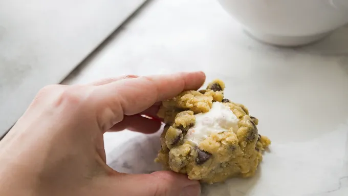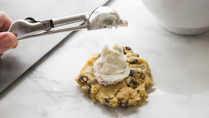 You’re just five ingredients away from buttery, fresh-baked chocolate chip cookies, with a secret stash of sweet vanilla Rainbow Chip frosting hiding inside. Prepare the glasses of ice-cold milk.