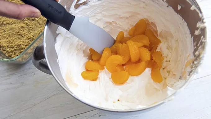Step2In a stand mixer, beat together cream cheese, simple syrup, whipped topping and yogurt until light and fluffy. Fold in mandarin oranges. Spread mixture over the crust. Top with remaining crumb.![]()