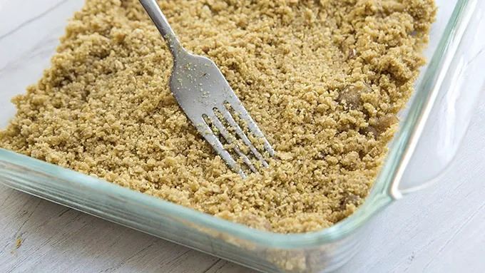 Step1Pour the Chex™ granola mix into a food processor and process until you achieve a fine crumb. Transfer to a large bowl and drizzle melted butter over the top. Sprinkle with flour. Use a fork to combine mixture into coarse crumbs. Spread half of the mixture into an 8x8-inch dish covered with parchment paper.![]()