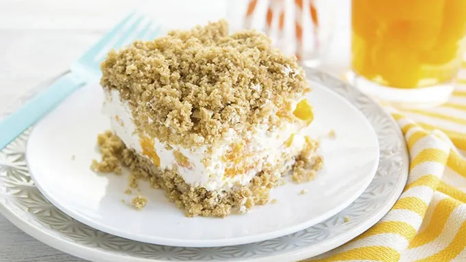 - When I was a kid, Grandma had a giant freezer in the back of her garage. One of those wide, industrial white ones, with a lid that lifted from the top. Whenever we’d visit her farm, while the adults settled in with lemonade on the back porch, we kids would sneak outside to see what was inside that big old freezer. There were always Creamsicles™. We’d peel away the paper wrapper to enjoy the sticky-sweet orange pops with a creamy layer of vanilla ice cream hidden inside. Sitting in the steaming heat of August at Grandma’s dusty farm, hidden away by the hay bales, we ate and made sweet memories, I can’t imagine a more refreshing retro flavor than classic Creamsicles™! Whether you snuck one from Grandma’s freezer, bought them from a roving ice cream man, or just love to buy boxes when they go on sale, there’s no denying the Creamsicle™ flavor combo is a total favorite. Which is why I decided to turn it into our favorite frozen crunch cake. On the heels of our famous Strawberry Crunch Cake, we decided it was high time there was a creamy orange version of this easy, freezy cake. Get ready for bright mandarins, folded into a sweet whippy center spiked with Orange Crème Yoplait™ yogurt and sandwiched between two layers of streusel. OMG—prepare to feel like a kid again. No lifting the top on Grandma’s giant freezer required! Slice and serve. And grab a fork, of course. Enjoy!
