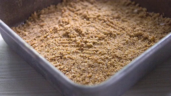 Unwrap granola bars and place in a food processor. Pulse until fine crumbs form. Add melted butter and sugar, pulse to combine. Pour half of the crumb mixture into the bottom of an 8x8-inch baking dish. Press flat.