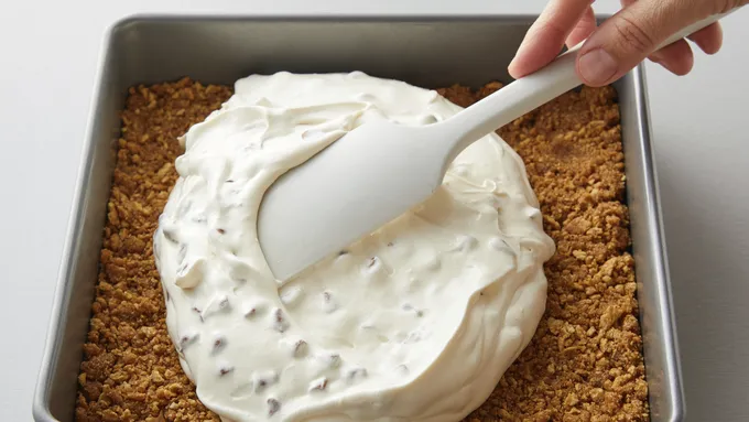 Step2In a stand mixer, beat together cream cheese, sweetened condensed milk and vanilla until smooth. Fold in whipped cream and cinnamon chips. Spread mixture on top of the crust.