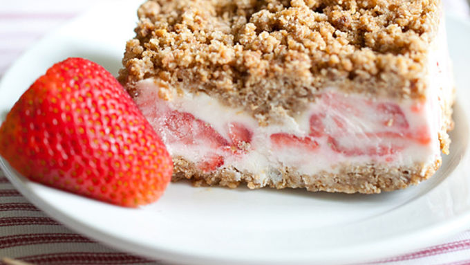 Frozen Strawberry Crunch Cake is the perfect frozen treat to serve at an outdoor summer get together. The irresistible crust is made with delicious Nature Valley Oats ‘n Honey granola bars mixed with brown sugar and butter (yum!). The frozen cake is a creamy whipped filling with cream cheese, sugar and lemon. Adding the fresh strawberries gives it a light flavor and crunchy texture. It’s a very unique dessert because it’s not really ice cream and it’s not cake either...it’s a frozen dessert.
