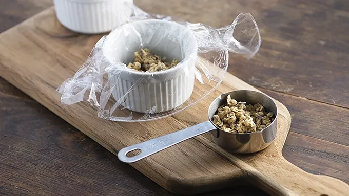 Step1Line two small 5-ounce ramekins with plastic wrap, leaving plenty hanging over the edges.