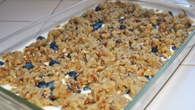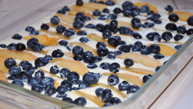 Step2Wash, peel and slice the peaches. Lay slices on top of batter. Wash blueberries and sprinkle over peaches.