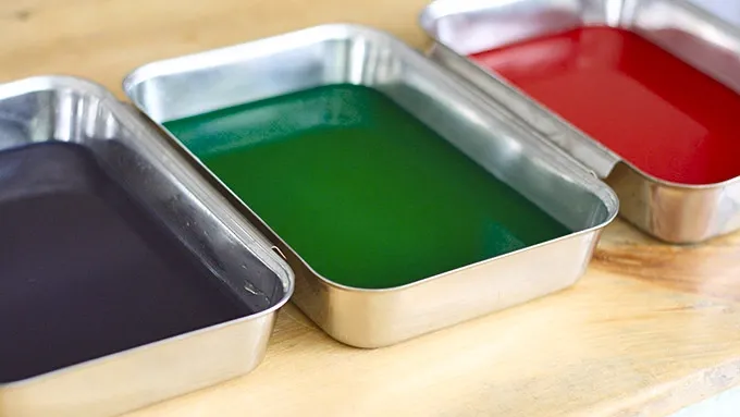Step5Separate the mixture evenly into the three small prepared pans. Using food coloring, dye each pan to desired colors. (Photo shows red, green and purple/blue.) Allow to set in refrigerator at least two hours or overnight.