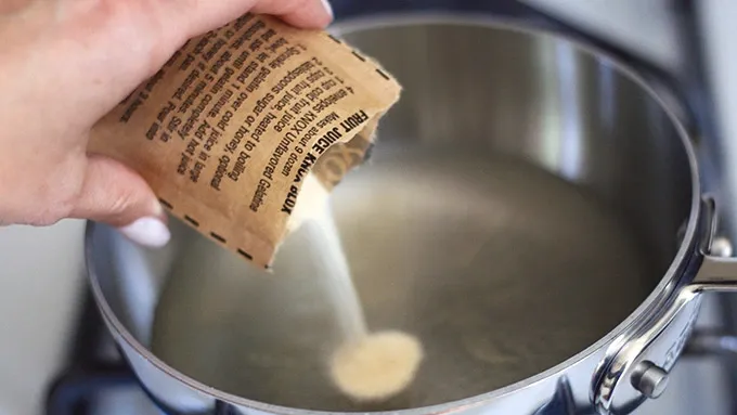 Step4To make the colored gelatin, place pineapple juice in a small saucepan and sprinkle with remaining two envelopes of unflavored gelatin. Allow it to soak in a minute or two. Heat on medium, stirring until gelatin has dissolved. Remove from heat and pour in the pineapple vodka.