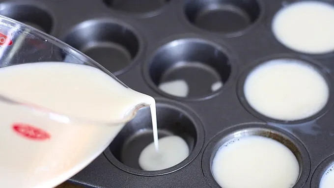 Step3Transfer to something with a pour spout (such as a measuring cup) and fill cavities of mini muffin pan with the white gelatin mixture. Place in refrigerators for four hours or overnight to allow gelatin to set properly.