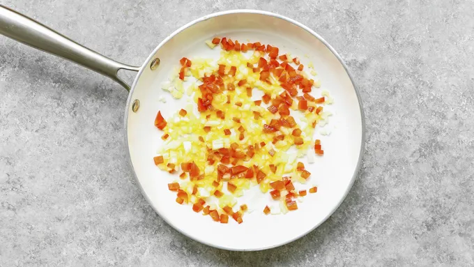 Step1Heat the oil in a large skillet and sauté the onion and sweet pepper until soft, about 3 minutes.