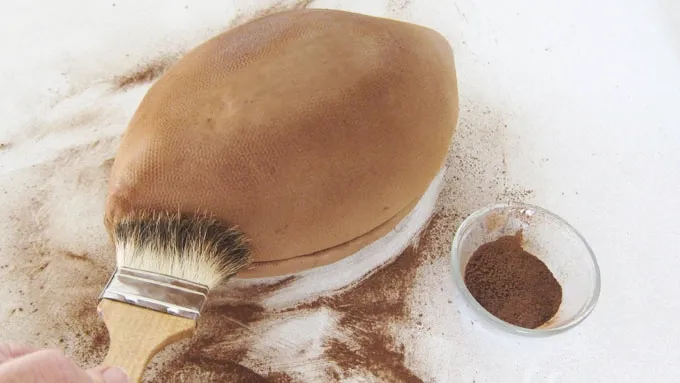 Step12Set the other cake on top, forming a 3 dimensional football. Cut a small football shaped piece of cardboard to go under the cake for support. Set cake on top.Brush entire football with some cocoa powder, to add dimension to the ball.