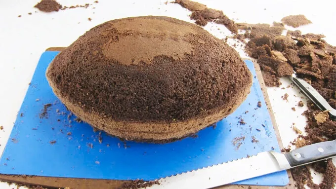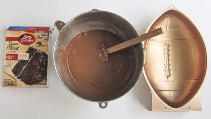Step1Devil's Food Cake Football halves: Make one devil's food cake according to package instructions. Pour into a football shaped baking pan that has been coated with baking spray. Bake at 325 degrees Fahrenheit for 50-55 minutes, until a skewer inserted into the center of the cake comes out clean. Repeat with second cake. Allow both cakes to cool completely then freeze for at least two hours.