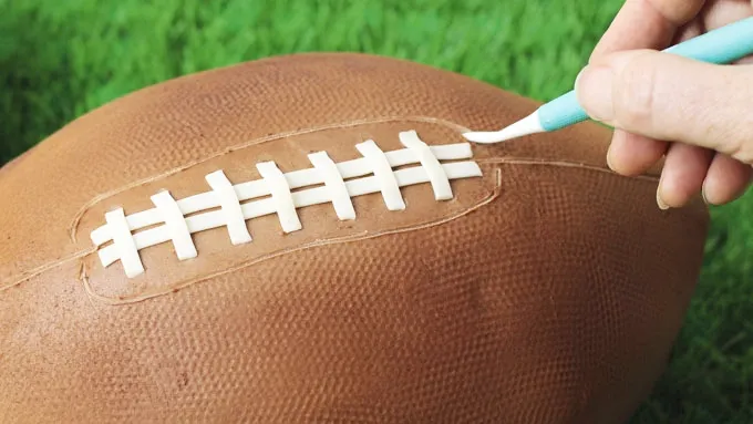 - For your favorite fans, a football cake so realistic they won't know whether to eat it or throw it! Are you ready for some football ... cake? Football has become a huge part of the fall season for my family. My nephew is on the varsity high school football team and our family spends Friday nights cheering his team on to victory. To celebrate the start of the season I created a three-dimensional football cake to serve to him and his teammates. The whole team was shocked to see how real the football looked, but were even more surprised when I cut into the cake to reveal little chocolate footballs hiding inside! Whether you're hosting a Monday night football party or getting ready for tailgating, this cake is sure to score big. Just be sure to give yourself an entire day because you'll need to bake three cakes. This creation uses two devil's food cakes, a chocolate pound cake, milk chocolate frosting, and modeling chocolate. It takes some time, but everyone was amazed at how realistic it looked – and it tasted great too! Easy tip: I find carving a frozen cake is much easier than using a freshly baked cake. I actually froze mine overnight and had great results. I wanted to set my cake on a piece of artificial turf for the party, so I just cut a small cake board into a football shape to fit underneath for some support. I could then just lift up the cake and set it on the fake grass. I honestly couldn't believe how real it looked. When I brought it to football practice and shared it with the team I was really excited to see the reaction from the kids. All my hard work had paid off!