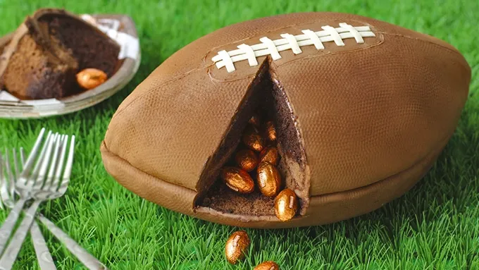 Step15Lift football cake and place on a piece of artificial turf or on a serving platter. Serve cake by carefully cutting into it, remembering the candy is hiding inside.