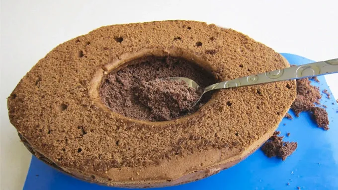 Step7Separate the cake into two parts again. Scoop out some (no more than 1/2 inch deep) of the devil's food cake, if desired to create a larger well to fill with candy.