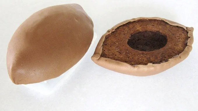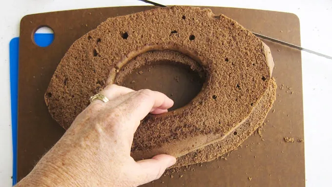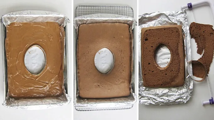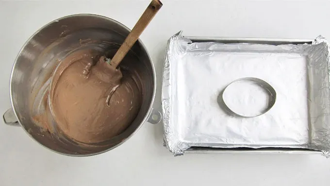 Step3Line a 9x13-baking pan with non-stick aluminum foil (or aluminum foil sprayed with non-stick spray.) Spray a 5-inch metal oval cookie cutter with non-stick spray and set it in the center of the pan. Pour chocolate pound cake batter into the pan, leaving the center oval empty. Bake for 28-32 minutes, until a toothpick inserted into the cake comes out clean. Cool for 10 minutes, then carefully remove the oval cookie cutter. Allow cake to cool completely, then peel off tin foil and level the cake, by removing the domed top.