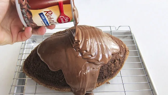 Step8Set each cake on a cooling rack set over a pan lined with parchment or wax paper. Heat Betty Crocker milk chocolate frosting in microwave for about 30 seconds until pourable. Pour frosting over cakes, smoothing it out with a spatula. Allow frosting to set.